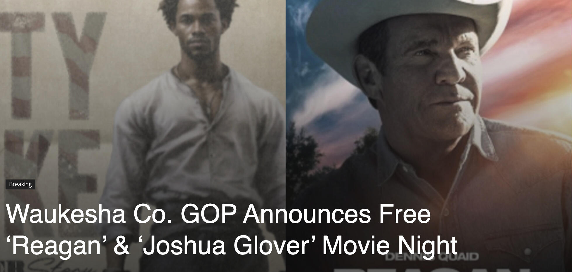 The Republican Party of Waukesha County “invites you to a powerful Movie Night on Wednesday, Feb. 26, at 7 p.m., as we celebrate the courage of those who shaped our nation’s history and honor one of America’s greatest presidents,” the party said in a statement sent to Wisconsin Right Now.The free double-feature consists of the “Reagan” movie starring Dennis Quaid and “Liberty at Stake: The Joshua Glover Story.”The Waukesha Co. GOP is located at W238N1700 Rockwood Dr. Suite C, Pewaukee, WI 53188.