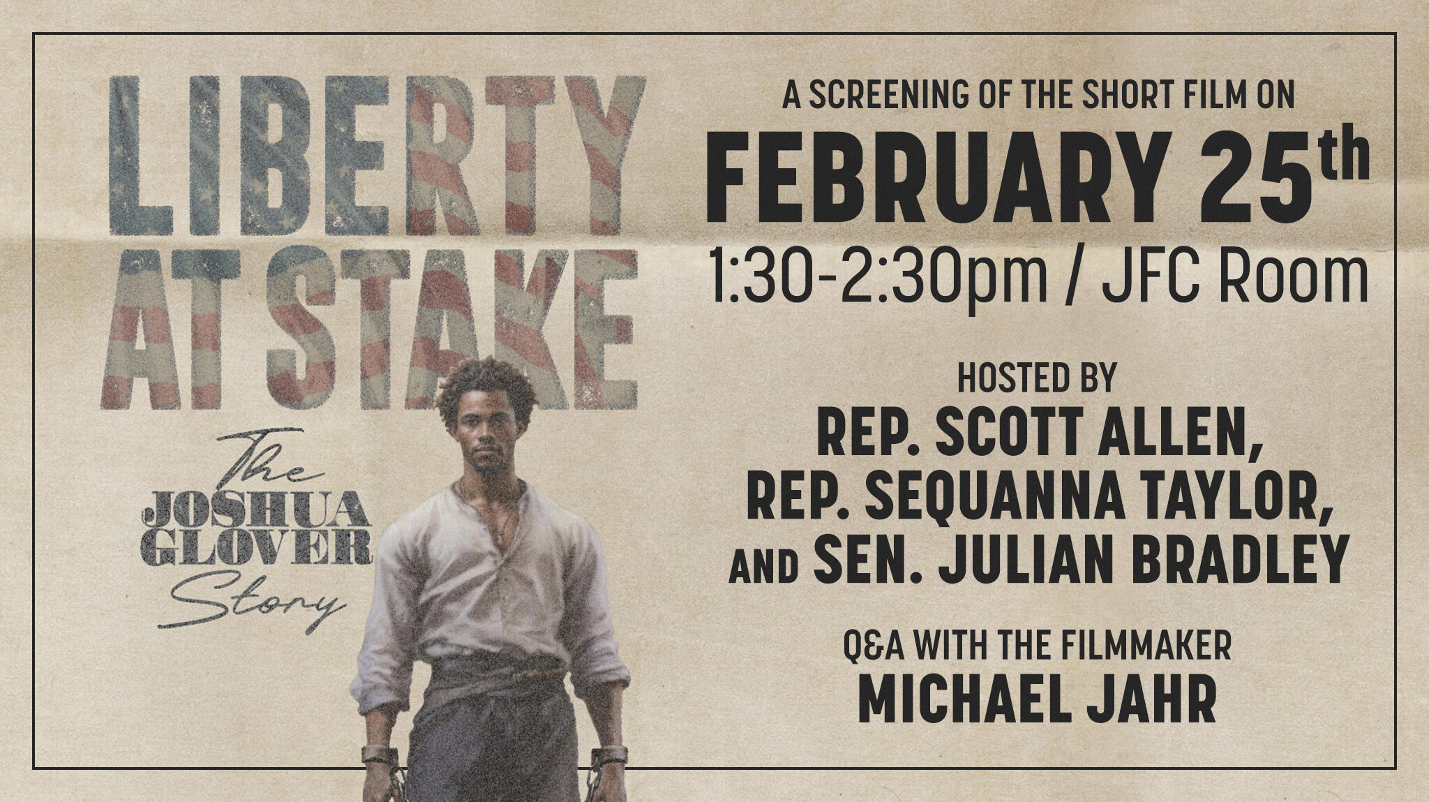 We have a unique opportunity to share the Joshua Glover story with Wisconsin legislators and their staff as part of Black History Month activities taking place in the Capitol. Liberty at Stake director/producer Michael Jahr will screen the mini-documentary for lawmakers and share the vision for a full-length film. The presentation will take place Feb. 25 and will be open to the public.